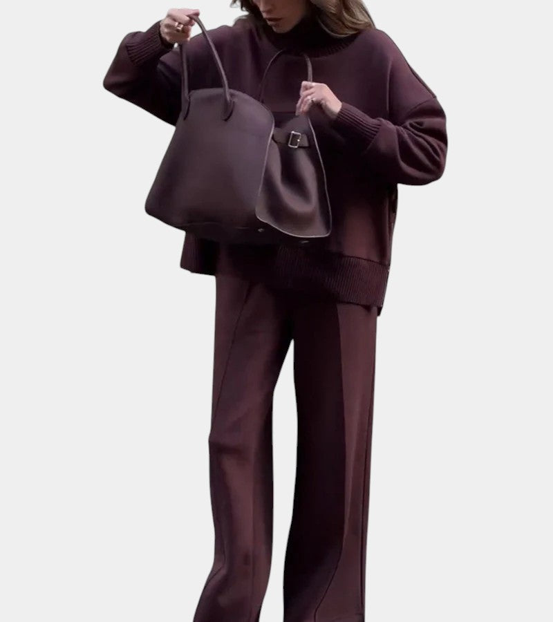 Immagina di affrontare le giornate più fredde avvolta in un completo che combina eleganza e morbidezza. Camilla™ è pensato per offrirti stile senza rinunciare al comfort: il maglione a collo alto con zip laterale dona un tocco moderno e sofisticato, mentre i pantaloni ampi assicurano libertà di movimento e una vestibilità impeccabile.